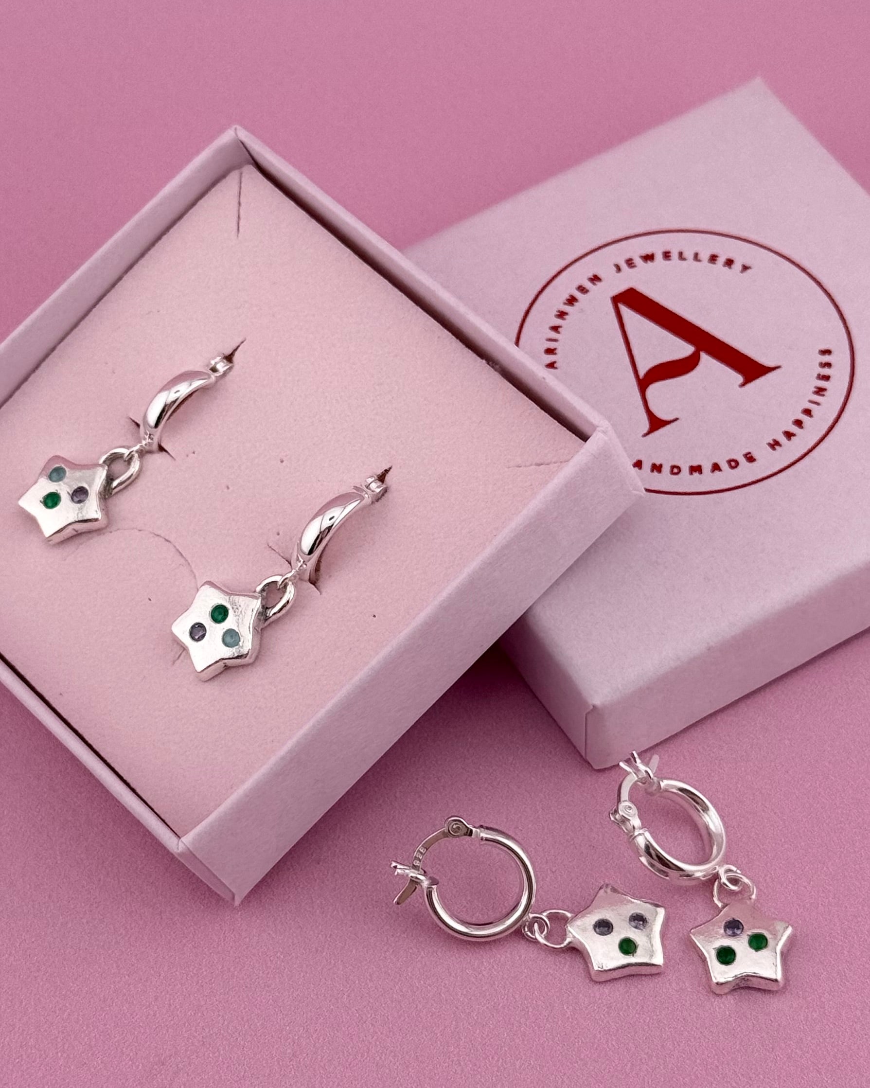 Introducing the Confetti Star Huggie Hoop Earrings! These playful earrings feature a mix of colourful 2mm cubic zirconia gemstones and are handmade from solid fine silver.