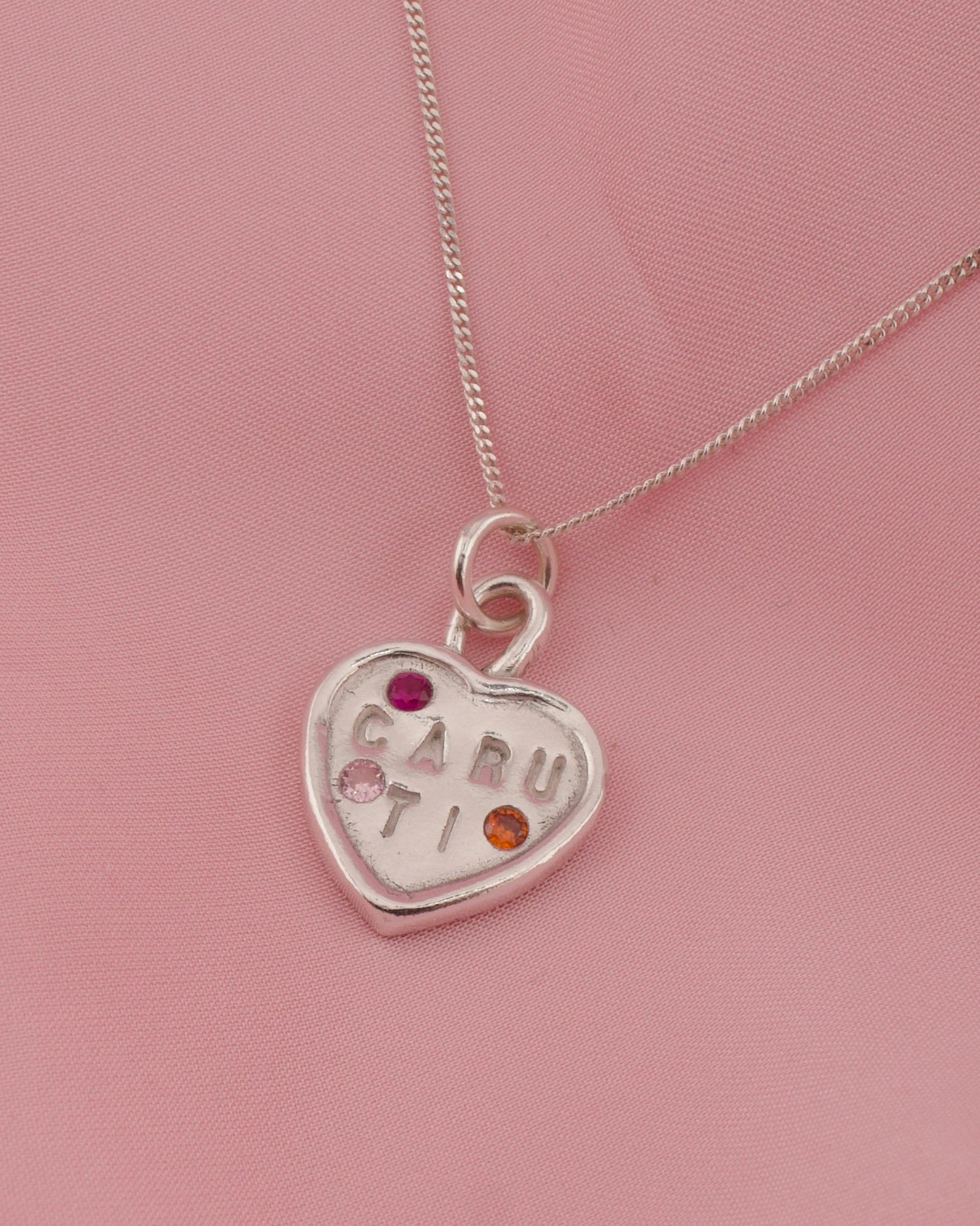 Add a touch of playful charm with this fun sweetheart necklace that is personalised to you! Featuring colourful cubic zirconia gemstones set in solid silver. This custom necklace is handmade in Wales to last a lifetime.