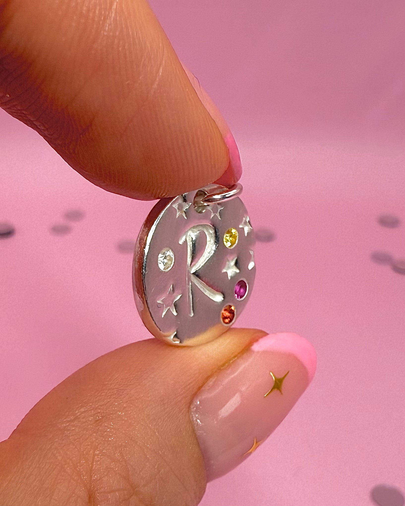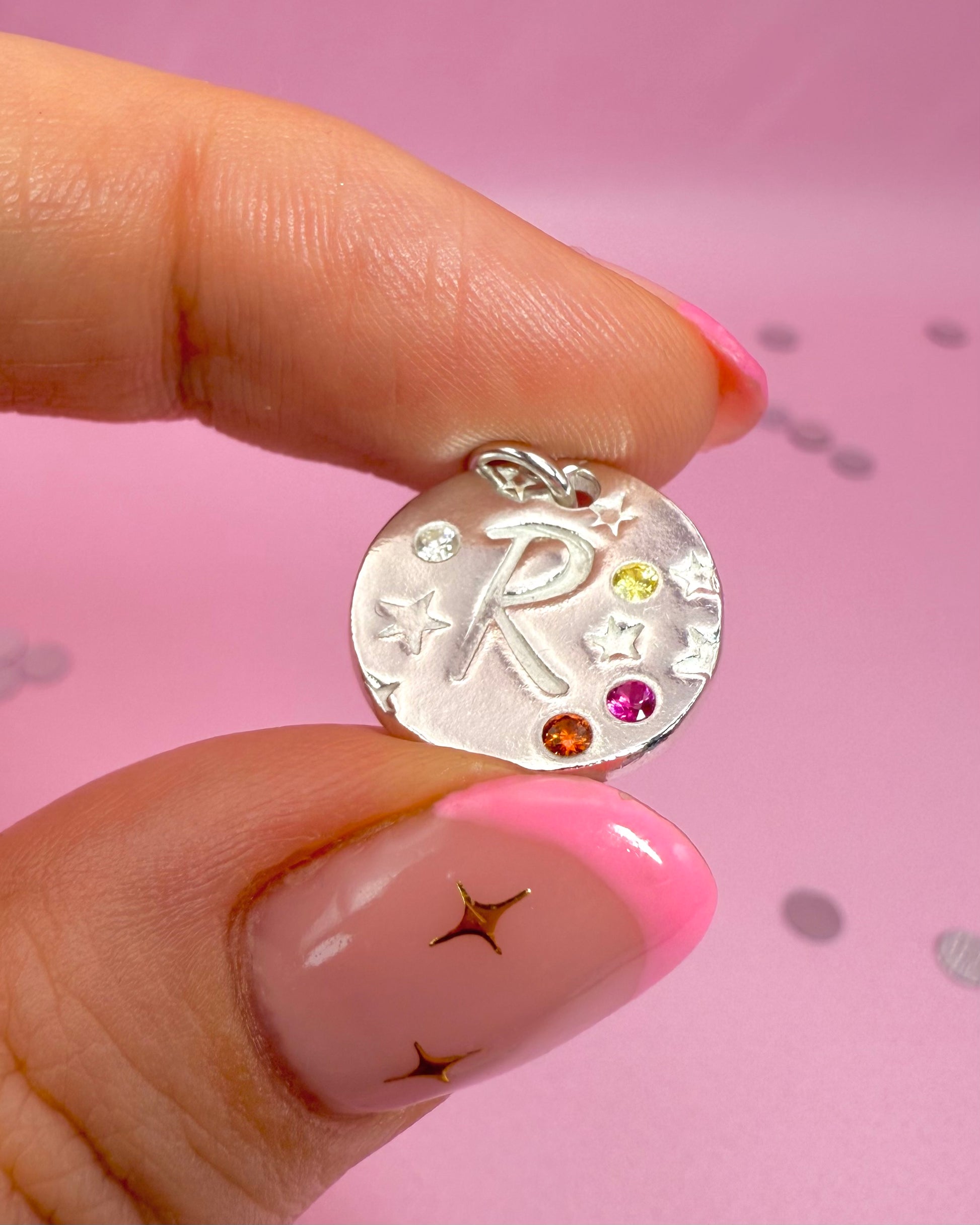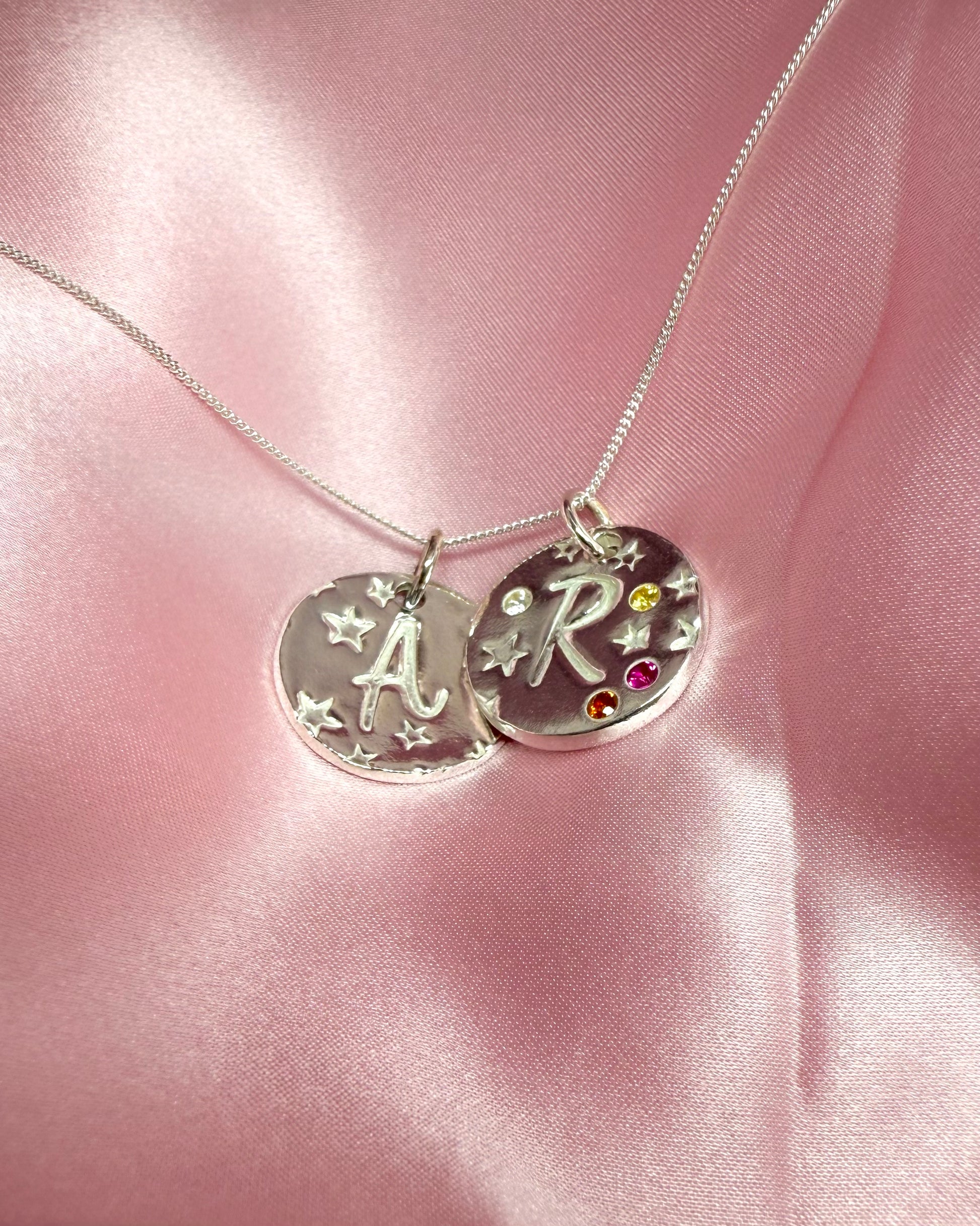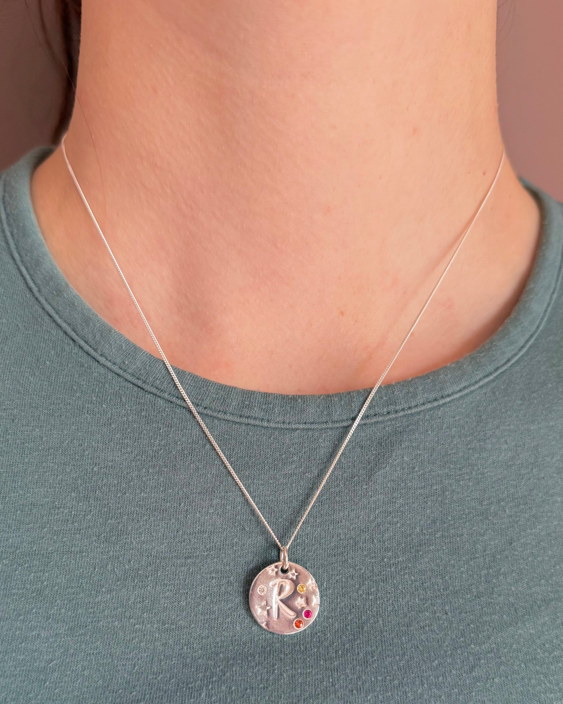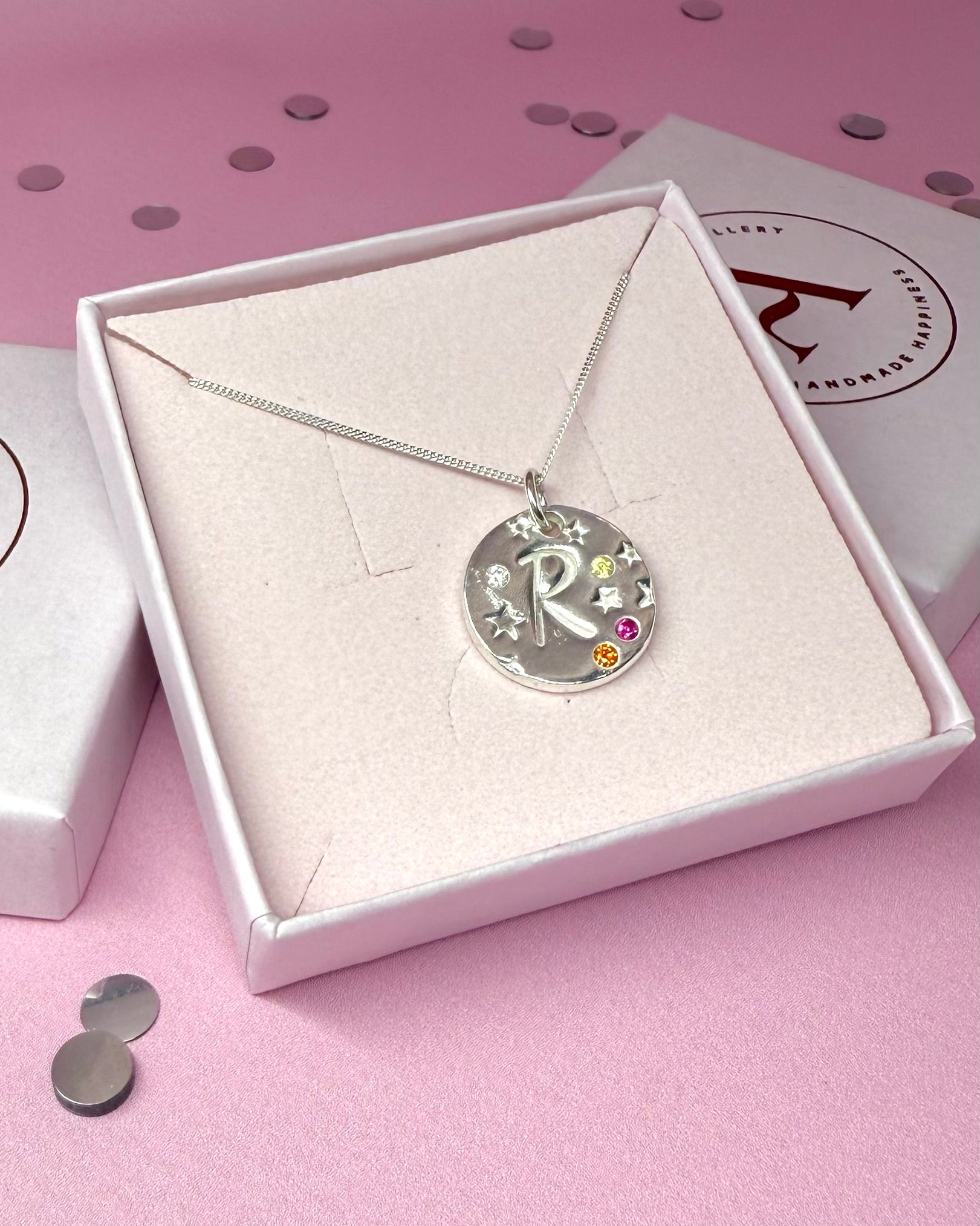 Add a personal touch to your style with the Seren Initial Pendant. Crafted in solid fine silver, this circular charm features your chosen initial surrounded by stamped star details and colourful cubic zirconia gemstones, perfect for everyday wear or a special occasion.