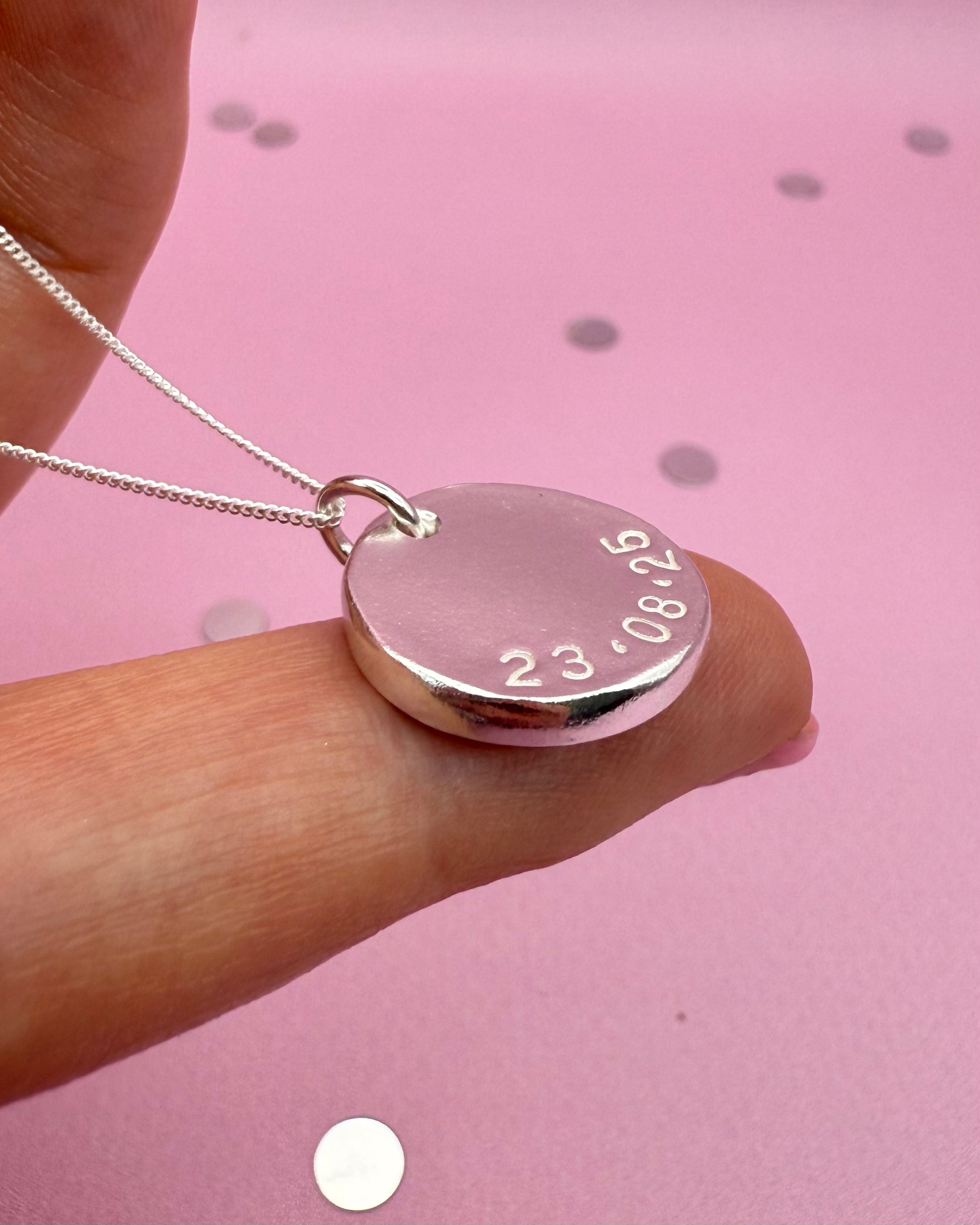 Order and add a note to 'order special instructions' section at checkout letting me know what text you’d like to include in the back of the pendant.